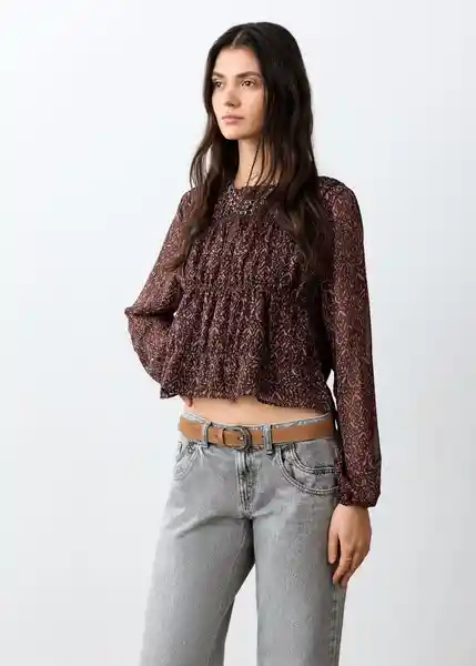 Bajo Con Volante Cuello Redondo Diseño Estampado Diseño Recto Manga Larga Semitransparente Panel Nido de Abeja Puños Fruncidos - 27021542_30.