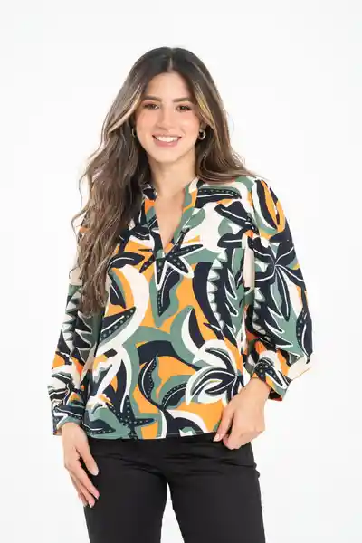 En Tejido Plano Estampado Cuello Nerú Detalle de Perilla Sin Botones en el Escote Delantero Manga 3/4 Con Recogido Parejo y Suave en Hombro Puño en Ruedo Con Botón de Pasta 18 L Espalda Lisa Aberturas de 6 cm a Lado y Lado Del Ruedo.