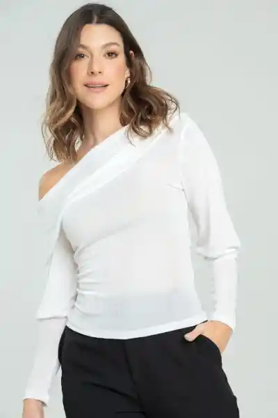 En Tejido de Punto Fondo Entero Con Acabado Especial Escote Asimétrico Con Recogido Suave en Hombro Derecho Fajón Que Sobrepone Sobre el Escote Puños Que Van Desde Debajo Del Codo Hasta el Ruedo Manga Larga Silueta Semi Ajustada.