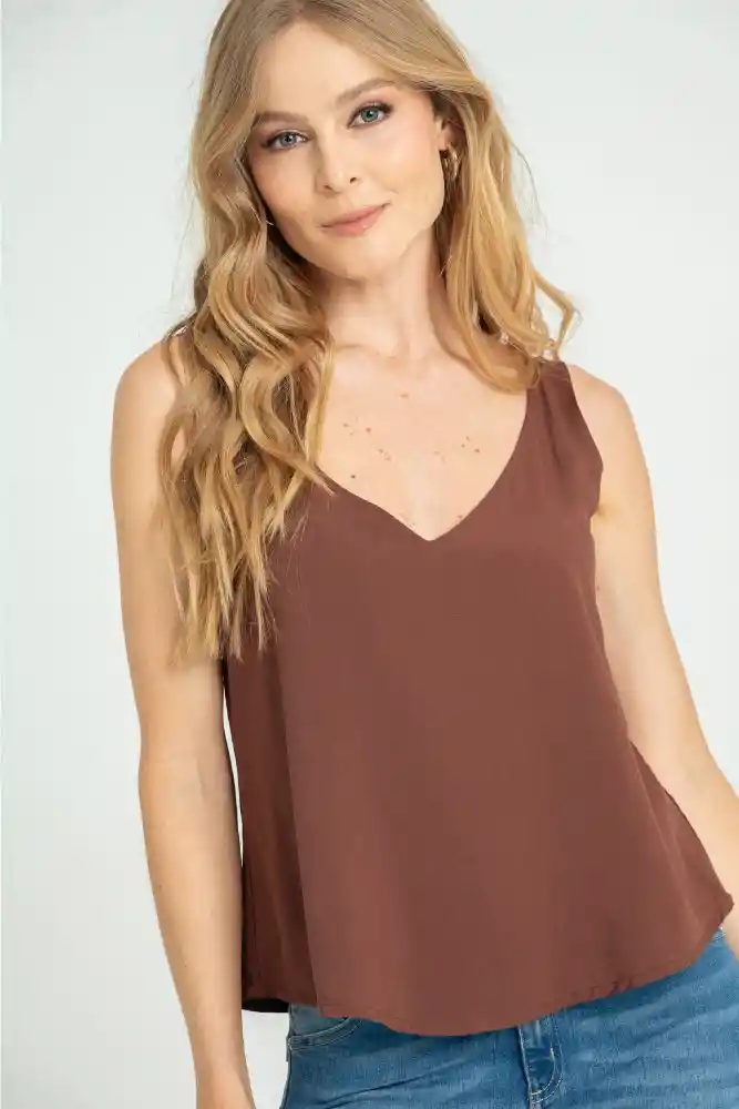 Blusa en chalis fondo entero, escote en V, manga sisa, silueta amplia.