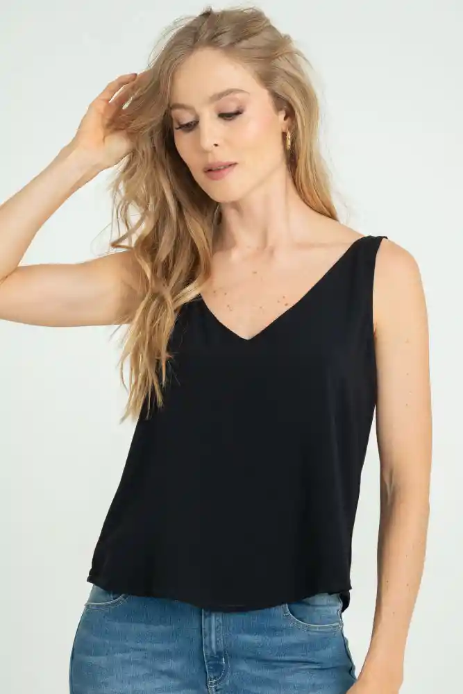 Blusa en chalis fondo entero, escote en V, manga sisa, silueta amplia.
