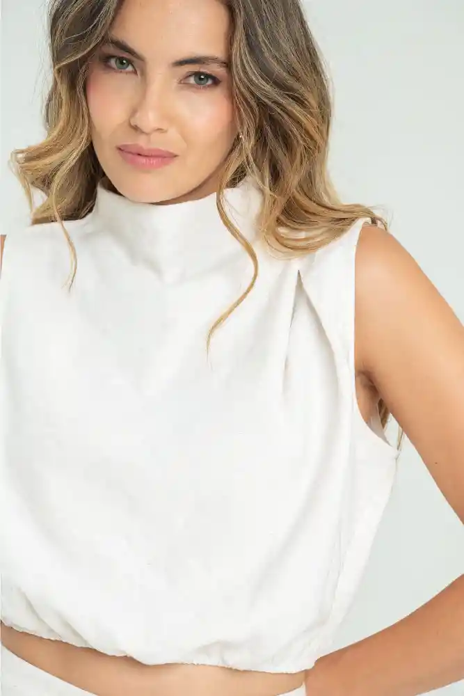 Blusa en tejido plano fondo entero, cuello alto con falso, abertura con botones 16L en la parte superior de la espalda, detalle de prense en hombro izquierdo en delantero, manga sisa con sesgo asentado en la parte interna, elástico de 1cm en ruedo.