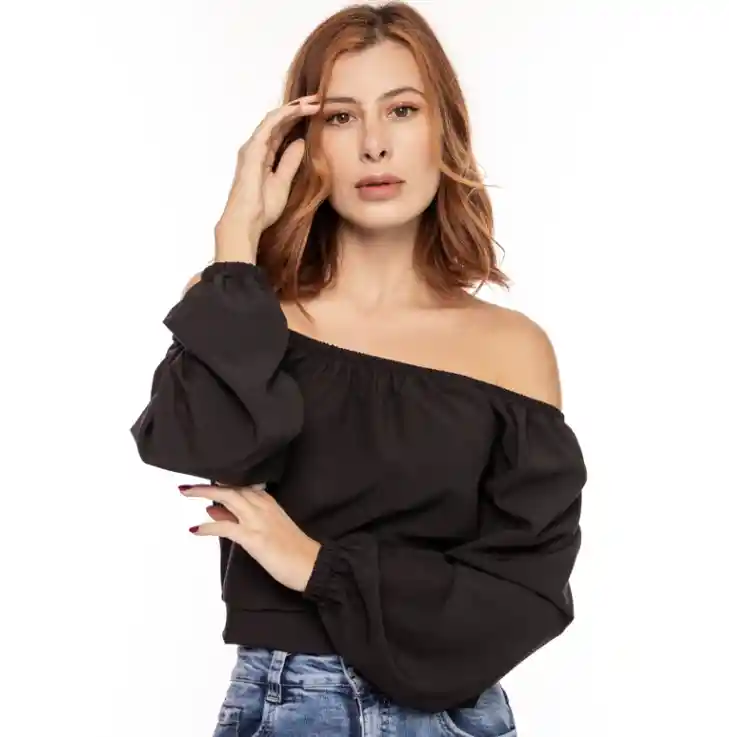 Talla única (S, M o L) Blusa negra cuello bandeja.