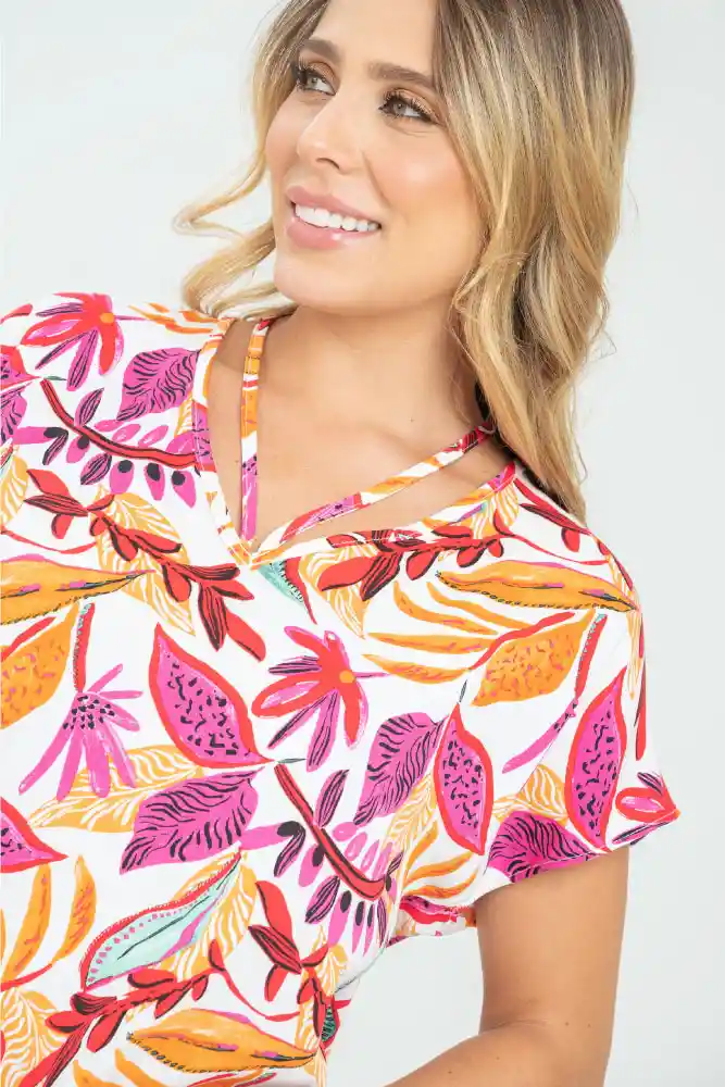 Blusa en tejido plano estampado, escote en V con sesgo de 1cm, juego de sesgos en el escote, manga corta rodada con ruedo de 0.8MM, aberturas de 6cm a lado y lado del ruedo, ruedo de 0.8MM, silueta semi ajustada.