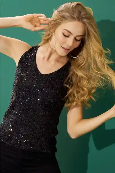 Mesh Con Lentejuelas Escote en V Manga Sisa Forro Interno Tejido de Punto Fondo Entero.