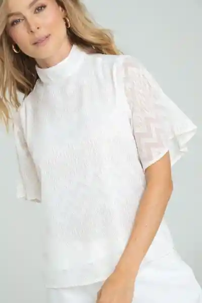 En Tejido Plano Chifón Con Lurex Cuello Alto Manga Corta Con un Poco de Vuelo Abertura Con Ojales y Botones de Pata en la Parte Superior de la Espalda el Cuerpo es Doble Capa Con Forro en Chifón Fondo Entero Silueta Semi Ajustada.