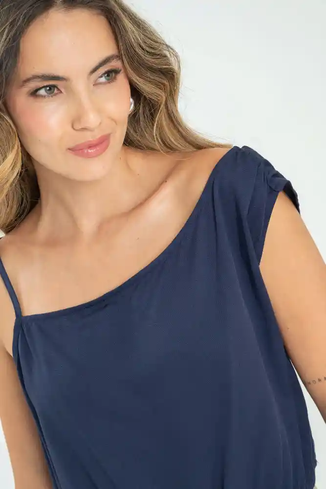 Blusa en tejido plano fondo entero, hombro derecho de tira, hombro izquierdo con manga corta caída con recogido en costado, largo pretina con ruedo en elástico de 1cms, silueta semi ajustada.