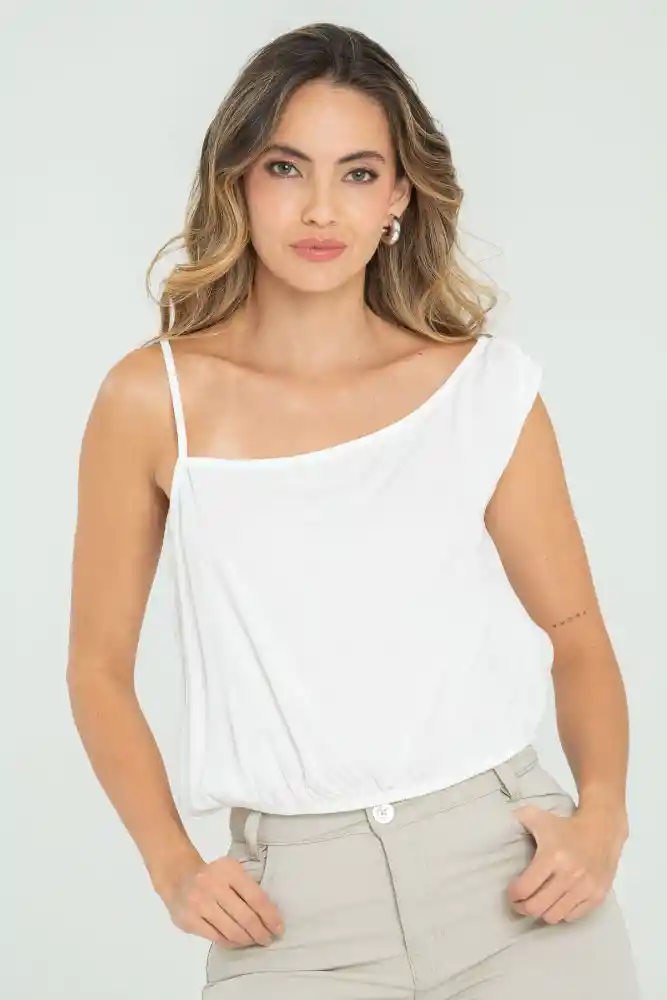 Blusa en tejido plano fondo entero, hombro derecho de tira, hombro izquierdo con manga corta caída con recogido en costado, largo pretina con ruedo en elástico de 1cms, silueta semi ajustada.
