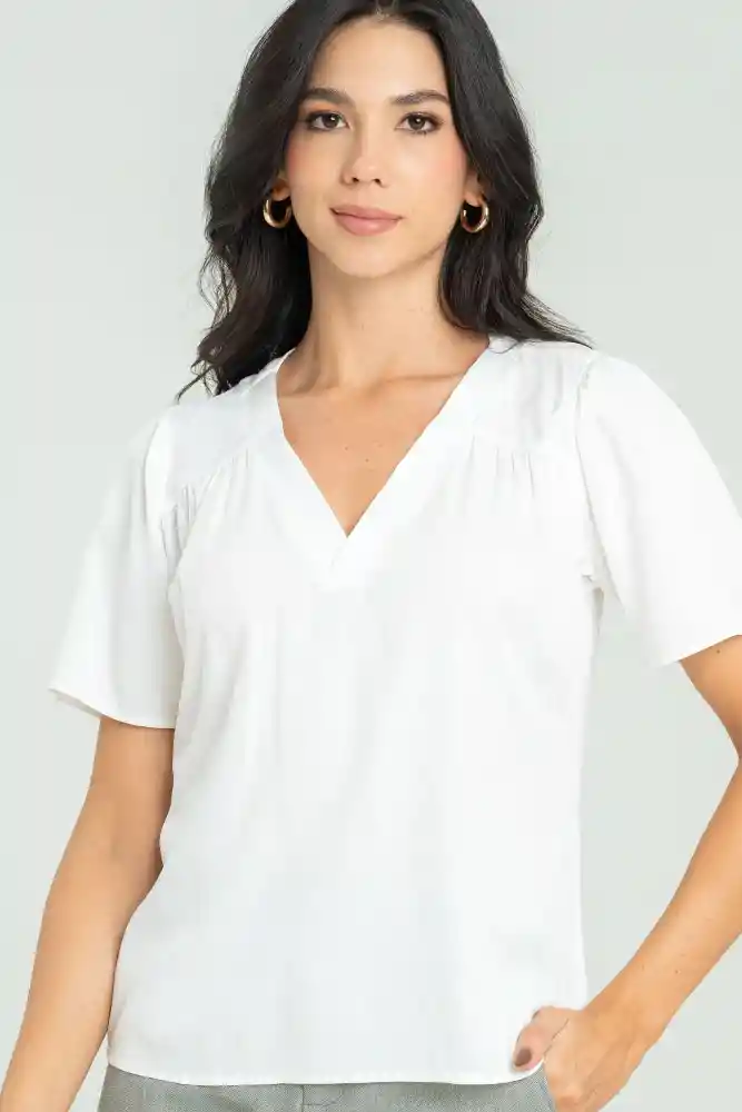 Blusa en tejido plano chalis, escote en V, manga corta , recogido en delantero y en almilla posterior, silueta amplia.