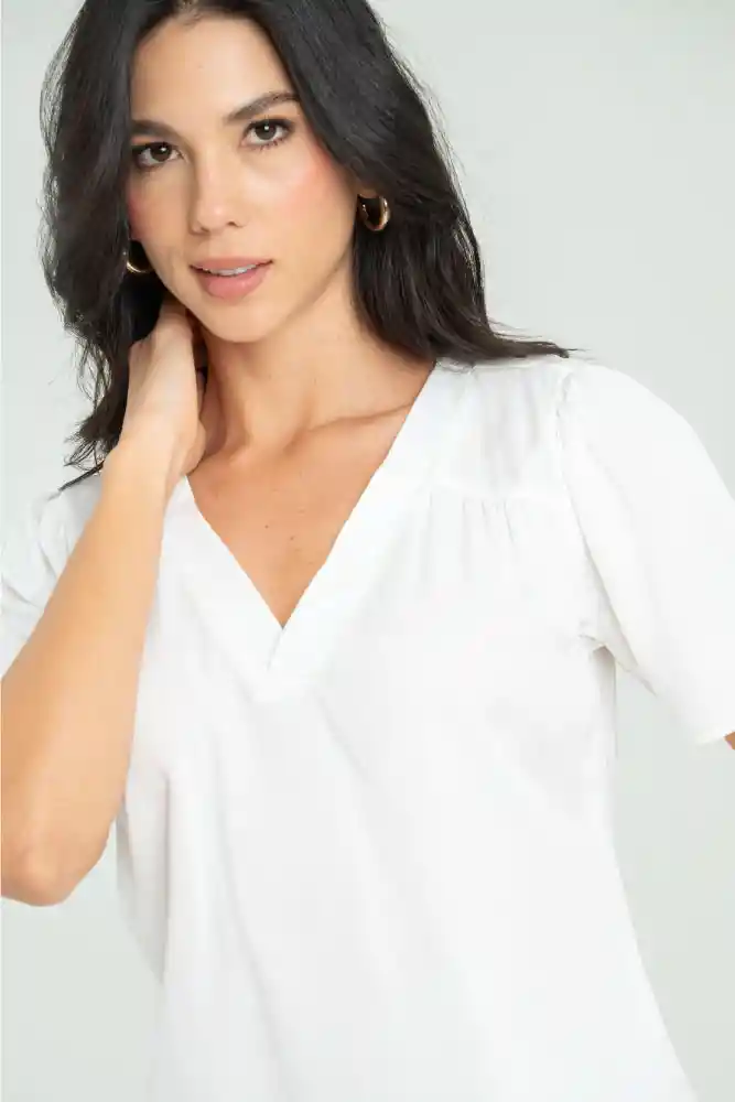 Blusa en tejido plano chalis, escote en V, manga corta , recogido en delantero y en almilla posterior, silueta amplia.