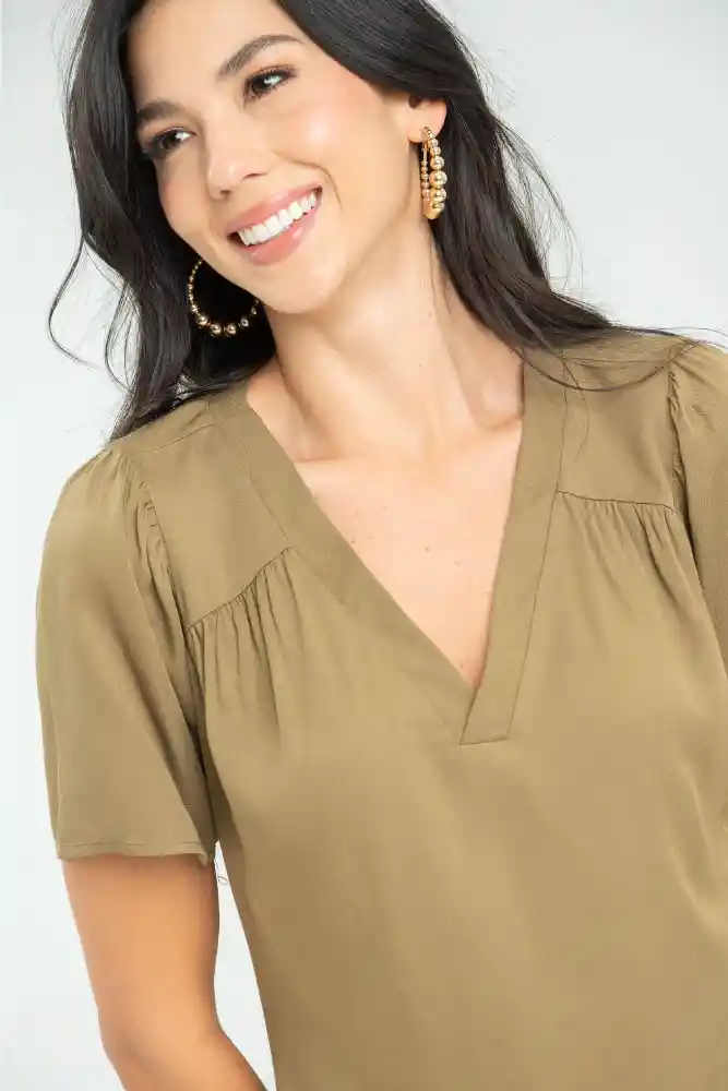 Blusa en tejido plano chalis, escote en V, manga corta , recogido en delantero y en almilla posterior, silueta amplia.