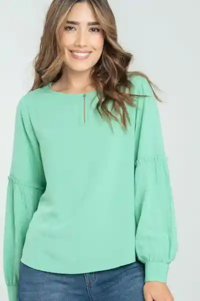 En Tejido Plano Fondo Entero Cuello Redondo Con Abertura en la Parte Delantera Con Botón de Pata 18L Manga Larga Con Corte y Rouche Decorativo Arriba Del Codo Puño en Ruedo Con Botones 18L Silueta Semi Ajustada.