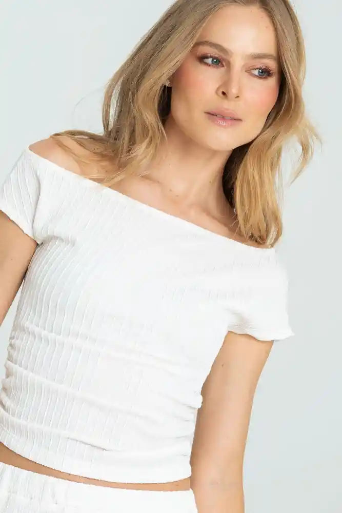 Blusa en tejido plano con textura especial, escote asimétrico con hombro caido, recogidos en los costados con elástico de 0.5mm, ruedo de 1cms, silueta semi ajustada.