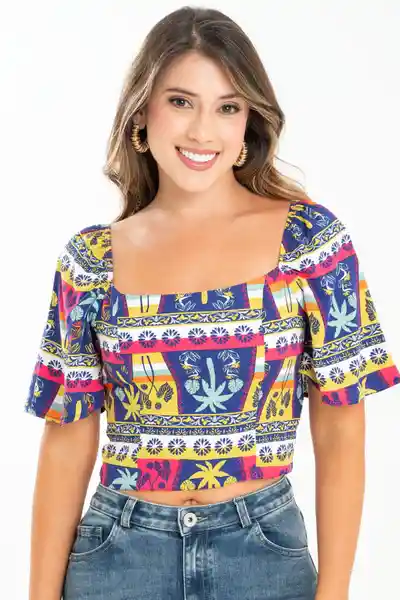 En Chalis Estampado Escote Recto Manga Corta Acampanada Silueta Ajustada Resortada en Espalda.