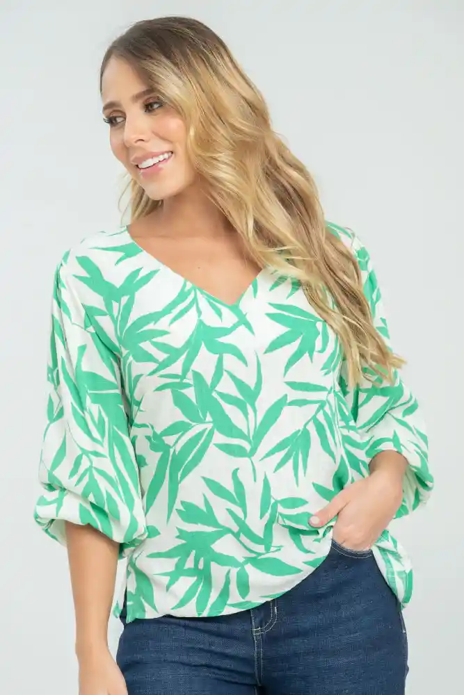 Blusa en tejido plano estampado, escote en V con falso, manga 3/4 con elástico en puño de 2cms, aberturas de 6cms a lado y lado del ruedo, silueta semi - ajustada.