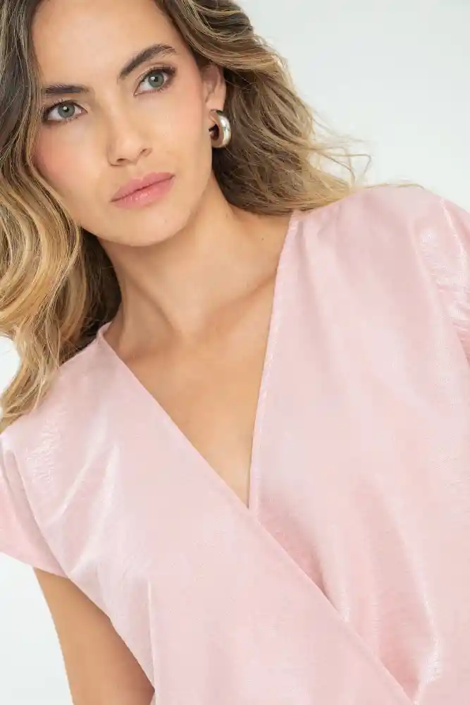 Blusa en tejido plano con brillo, escote cruzado, manga rodada, fajón en ruedo con elástico de 2cms, silueta semi ajustada.