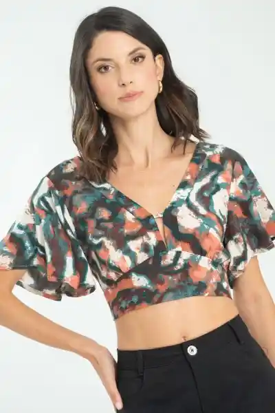En Tejido Plano Estampado Escotes Tanto en Delantero Como en Posterior Sostenido Con Pasador Fajón en Ruedo Que Termina en Tiras Que Anudan en Centro Espalda Manga Corta Con un Poco de Vuelo Silueta Semi Ajustada.