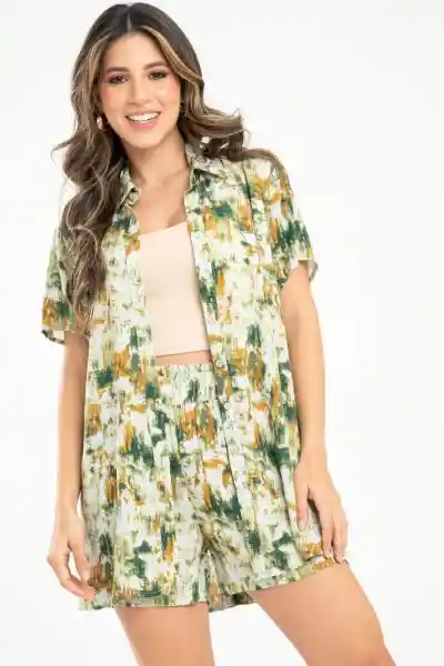 En Tejido Plano Estampado Cuello Camisero Perilla en Centro Frente Con Botones 18L Manga Corta Con Ruedo de 0.8 mm Espalda Lisa Aberturas en Los Laterales Silueta Tipo Blusón.
