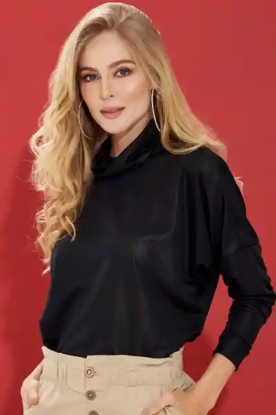 Blusón Tejido de Punto Fondo Entero Cuello Alto Drapeado Manga Larga.