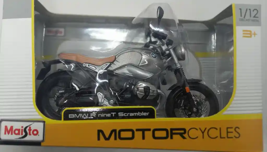 Espectacular Moto Modelo BMW R nineT Scrambler. Escala 1/12 Pertenece a la coleccion Maisto Motorcycles Material metálico, color plata con sillin caoba. Mide 18 cm de largo. La moto se puede parar para ser exhibida si se desea sacar del empaque, su presentación en empaque individual con blíster que permite apreciar el producto desde los laterales sin ser abierto, el producto esta sostenido a una base plástica transparente para evitar averías del modelo a escala, producto licenciado y pertenece a una edición especial del fabricante Maisto Motos que componen la coleccion (12 und) Motorcycles: (BMW R nineT Scrambler, SUZUKI V-Strom, DUCATI Hypermotar SP, DUCATI Diavel Carbon, BMW R 1200 GS, KAWASAKI Z900RS Cafe, KAWASAKI Ninja ZX-10R, HONDA CBR1000RR, HONDA CBR600RR, SUZUKI GSX-R1000, HUSQVARNA FE 501, KTM 1290 Super Duke R) Nos esmeramos en empacar muy bien nuestros productos. Recomendación: Mantener en un espacio fuera de humedad, para niños mayores de 8 años. Precaución: Puede contener piezas pequeñas que pueden causar asfixia. Atención utilizar bajo la vigilancia de un adulto.