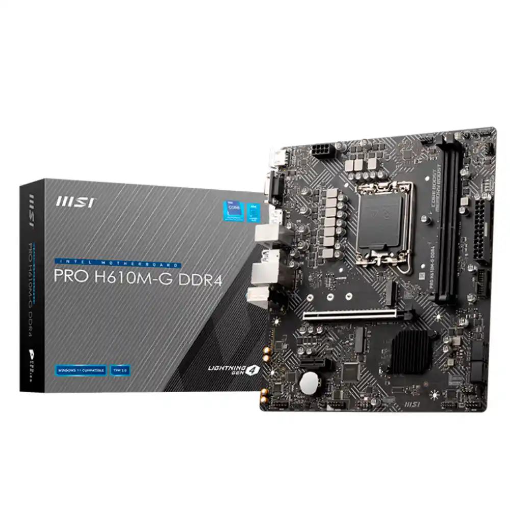 La MSI PRO H610M-G es una placa base de formato M-ATX diseñada para sistemas de gama media, compatible con procesadores Intel® Core de 12.ª generación y otros como Pentium Gold y Celeron®. Soporta hasta 64 GB de memoria DDR4 con frecuencias de hasta 3200 MHz. Dispone de expansión PCIe 4.0 x16 y PCIe 3.0 x1, además de una ranura M.2 para Wi-Fi. Ofrece salidas de video HDMI 2.1 (4K a 60 Hz), VGA y DisplayPort 1.4. Con 4 puertos SATA 6 Gb/s y 1 puerto M.2 PCIe 3.0 x4, también incluye USB 3.2 y USB 2.0, audio de 7.1 canales y un puerto LAN 1 Gbps. Compatible con Windows 11, es ideal para tareas generales y juegos ligeros. Especificaciones: Procesador: Admite procesadores Intel® Core de 12.ª generación , Pentium Gold y Celeron Chipset: Intel H610 (LGA1700) Memoria: 2 ranuras de memoria DDR4, admite hasta 64 GB1 Admite 1R 2133/2666/2933/3200 MHz (por JEDEC y POR) Admite modo de doble canal Admite memoria sin búfer y sin ECC Ranura de expansión 1 ranura PCIe x16 (desde la CPU) Admite hasta PCIe 4.0 x16 1 ranura PCIe x1 Admite PCIe 3.0 x1 1 ranura M.2 con clave E solo para módulo WiFi PCIe (M2_ WIFI1) Gráficos integrados 1x HDMI 2.1 con puerto HDR, admite una resolución máxima de 4K 60Hz1 2 1 puerto VGA, admite una resolución máxima de 2048x1536 50Hz, 2048x1280 60Hz, 1920x1200 60Hz 1x Puerto DisplayPort 1.4, admite una resolución máxima de 4K 60Hz1 2 Puertos SATA: 4 puertos SATA de 6 Gb/s1 (SATA7 no estará disponible al instalar un SSD SATA M.2 en la ranura M2_1). Ranura para SSD M.2: 1 ranura M.2 (clave M, del chipset)1 Admite hasta PCIe 3.0 x4 Admite hasta SATA 6 Gb/s Admite dispositivos de almacenamiento 2242/2260/2280 Admite la tecnología Intel® Smart Response para procesadores Intel Core USB 4 puertos USB 3.2 Gen 1 de 5 Gbps (2 puertos tipo A en el panel posterior, 2 puertos disponibles a través del conector USB interno) 6 puertos USB 2.0 (4 puertos tipo A en el panel posterior (hub-GL850G), 2 puertos disponibles a través del conector USB 2.0 interno) Audio: Códec Realtek ® ALC892/ALC897 (Audio de alta definición de 7.1 canales) LAN: Intel® I219V de 1 Gbps Conectores de alimentación 1 conector de alimentación principal ATX de 24 pines 1 conector de alimentación ATX de 12 V y 8 pines Conectores de ventilador 1 conector de ventilador de CPU de 4 pines 1 conector de ventilador del sistema de 4 pines Conectores del sistema 1x conector de audio del panel frontal 2 conectores del panel del sistema 1x conector de intrusión de chasis 1x conector de módulo TPM Características del LED 1 conector LED RGB de 4 pines 2 conectores LED ARCOÍRIS de 3 pines 4 LED de depuración EZ Puertos del panel posterior HDMI™ VGA Puerto de visualización Teclado/ratón USB 3.2 Gen 1 5 Gbps Tipo A Puerto LAN Conector de audio USB 2.0 Dimensiones: M-ATX (23,6 cm x 20,2 cm) Sistema operativo: Compatibilidad con Windows ® 11 de 64 bits Garantia: 12 Meses