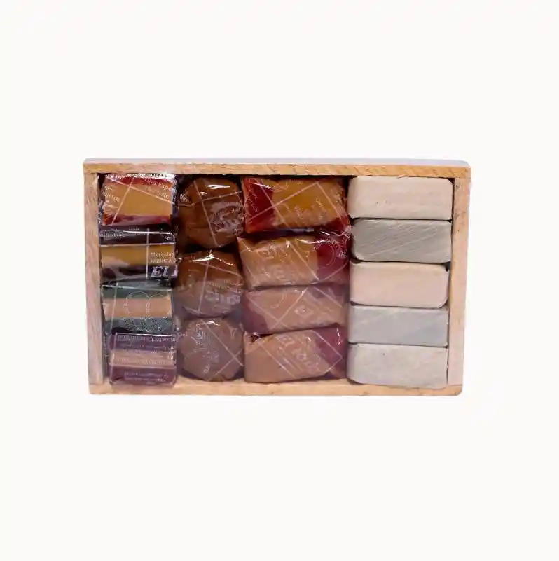 Caja de madera con 16 unidades de bocadillos veleños surtidos: Bocadillo de guayaba Bocadillo de guayaba con manjar de leche Dulce de leche Dulce de café con manjar de leche Dulce de feijoa con manjar de leche Dulce de mora con manjar de leche