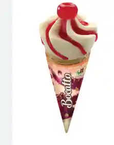 Bocatto de fresa Combinación de helado de fresa y vainilla, Con trocitos de maní, Salsa de fresa como topping, Dedito de chocolate, Punta de chocolate.