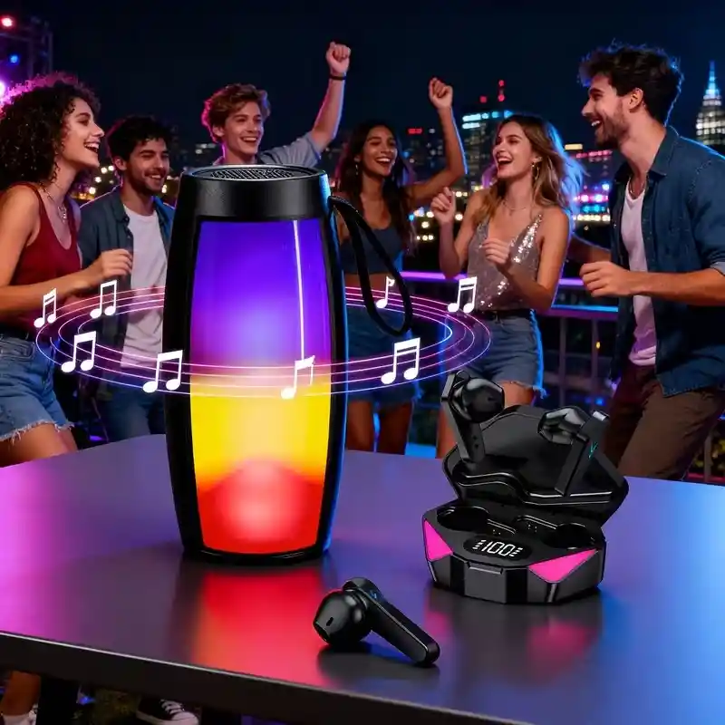 Este producto incluye una bocina (altavoz) portátil inalámbrica y audífonos inalámbricos, diseñados para ofrecer una experiencia de sonido práctica y versátil en distintos entornos. La bocina proporciona sonido estéreo con buena definición y refuerzo de bajos, además de incorporar iluminación LED dinámica que aporta un estilo moderno. Su diseño portátil facilita su uso en el hogar, la oficina o exteriores. Características principales Incluye bocina (altavoz) y audífonos inalámbricos Sonido estéreo HiFi con bajos mejorados Conectividad Bluetooth estable y compatible con múltiples dispositivos Audífonos de baja latencia, ideales para gaming y multimedia Pantalla LED digital para visualizar el nivel de batería Iluminación LED dinámica en la bocina Control táctil en los audífonos Diseño portátil, moderno y funcional