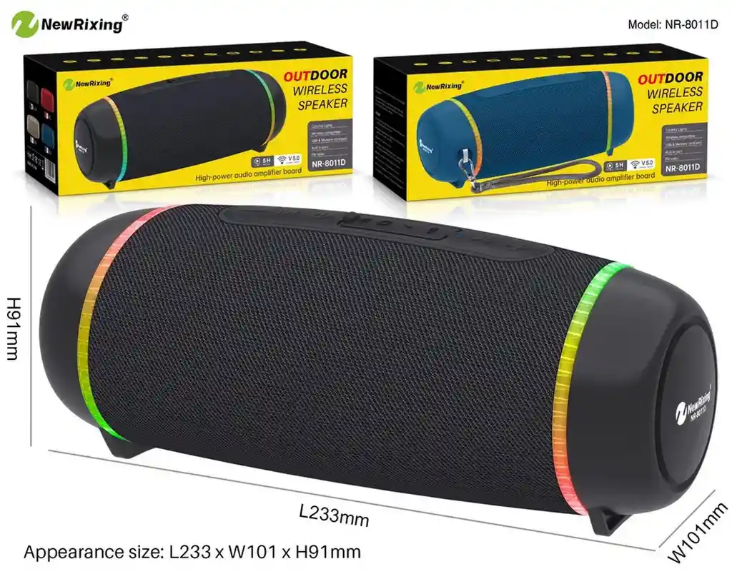 Los hermosos Parlantes Inalambrico Bluetooth recargable , son tendencia en la actualidad gracias a su diseño ergonomico y resistente, te permitira llevarlo a tus lugares favoritos. Este reproduce sonido de calidad y nitidez desde cualquier dispositivo que admita la conexión bluetooth El producto contiene: Parlante Cable USB para carga. Ficha Técnica: Bateria de 1200 Mah Duraciòn: 5 Horas aprox Resistente al agua (Salpicaduras de agua) Recargable por cable Usb Conexión Inalámbrica: Bluetooth Batería: Litio Dimensiones : 23.3 cm x 9.1 cm x 10.1 cm Ranura USB Y SD CARD Comandos Básicos (Botones): ON/OFF, Rewind, Forward (También Controla el Volumen), Pause, Términos de garantía: Para defectos de fábrica o retractos: Por favor revise el producto apenas lo reciba y antes de usarlo. No aplican ley de retracto o defectos de fábrica luego de usar el producto. Se manejan máximo 5 días para reportar defectos de fábrica (por ejemplo, producto funciona mal, piezas faltantes, rotas, etc). Para hacer efectiva la devolución el producto debe devolverse con el empaque original, el cual debe estar en buen estado, incluir todos los documentos y las partes completas y sin daños.