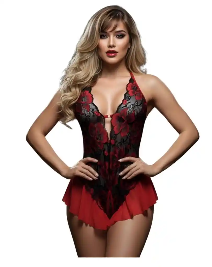 BODY ENTREGA INMEDIATA SARAY Detalles del Producto: Encaje Premium: Confeccionado con un delicado encaje negro de alta calidad, adornado con bordados florales en rojo vibrante que resaltan sobre la piel. Escote Halter Profundo: Diseño de cuello halter que estiliza los hombros y un escote en «V» pronunciado que realza el busto de forma natural. Faldón de Tul: Incorpora una suave caída de tul rojo en la cadera que aporta un toque femenino y juguetón. Diseño Funcional: Totalmente abierto en la parte inferior, ofreciendo acceso total y comodidad sin perder el estilo. Ajuste Flexible: Material elástico que se adapta perfectamente a tus curvas.