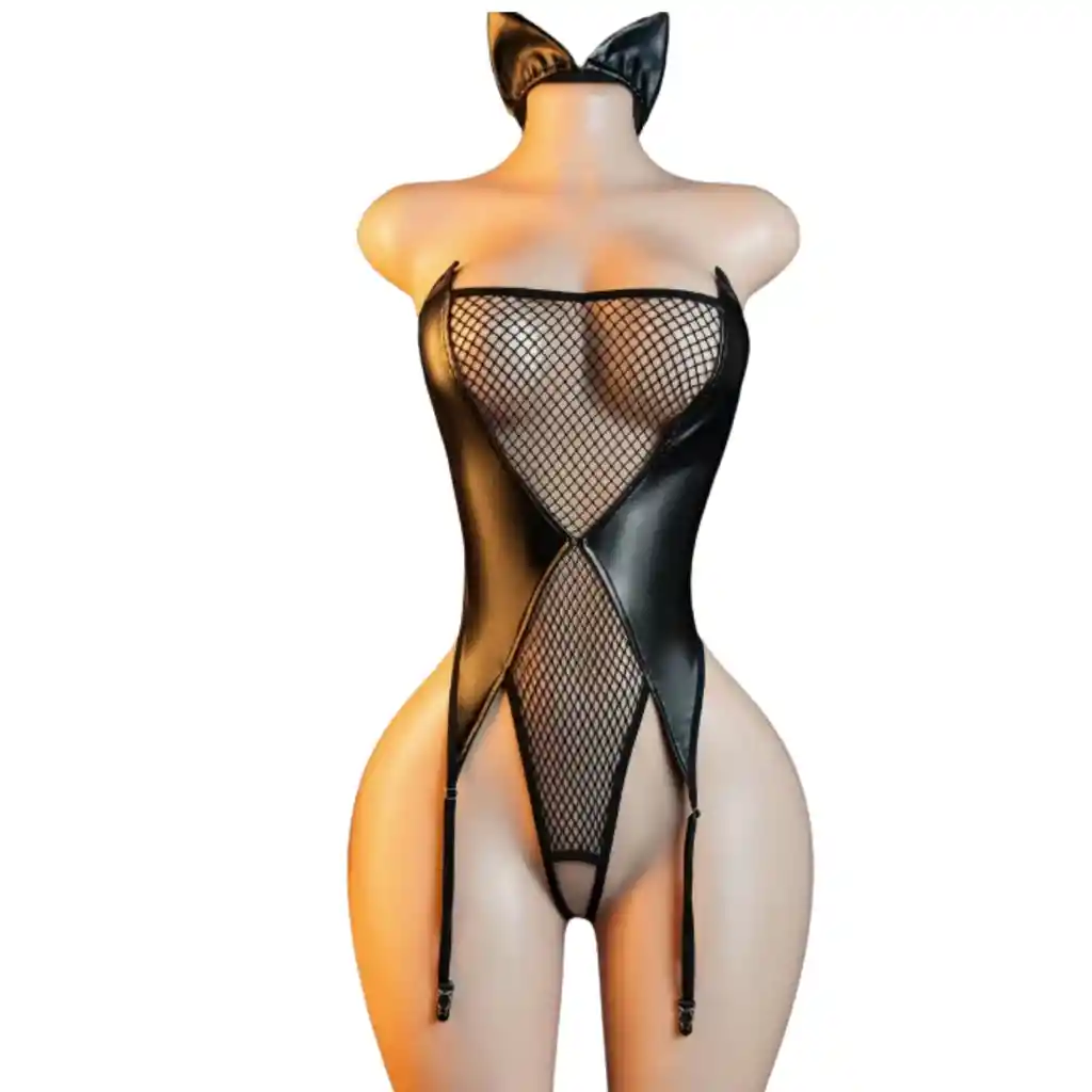 Body femenino de estilo sensual y elegante, elaborado en combinación de tela tipo cuero sintético y malla tipo red que crea un efecto visual llamativo y sofisticado. 💎 Características: Diseño strapless (sin tirantes) que realza el escote. Panel central en malla transparente que estiliza la silueta. TALLA UNICA Corte tipo corsé que define cintura y busto. Ligueros ajustables para un look provocador y elegante. Incluye diadema con orejas a juego para un toque coqueto y atrevido.