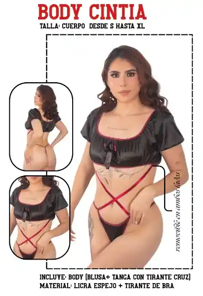 Body Cintia: Elegancia y sensualidad en una sola pieza. ✨ Atrévete a destacar con nuestro nuevo Body Cintia. Diseñado en licra espejo de alta calidad, este conjunto de dos piezas combina una blusa de estilo delicado con una tanga de tirantes cruzados que definen tu silueta de manera espectacular. Detalles únicos: Los tirantes laterales son removibles, permitiéndote ajustar el look a tu gusto. Comodidad total: Elaborado con tirantes de bra ajustables para un soporte perfecto. Tallas: Ajustable desde la S hasta la L. ¡Siéntete segura, poderosa y lista para brillar! 🖤❤️