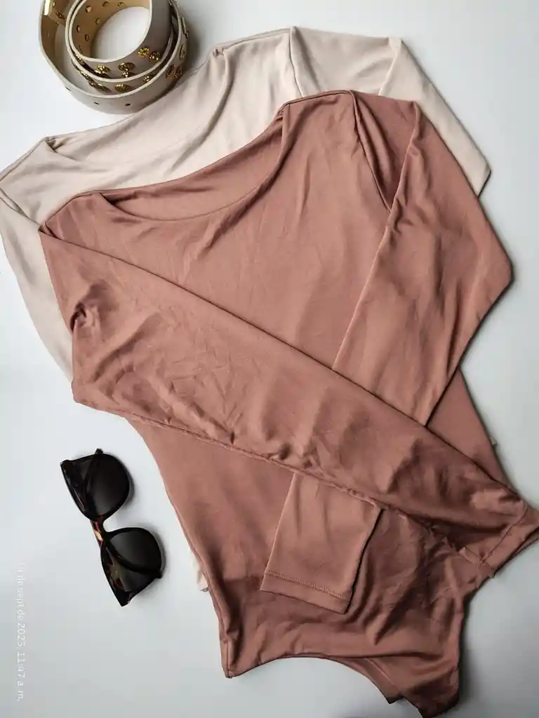 Body manga larga, cuello redondo, talla única, color caramelo.