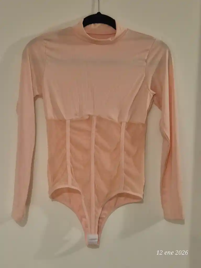 Body manga larga con transparencia, cuello Redondo, Talla unica color palo de rosa