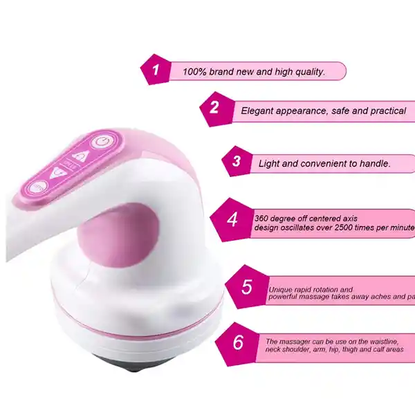Con Este Novedoso Masajeador Con Infrarrojo Podrás Trabajar y Obtener Beneficios de Forma Eficaz; y en Cualquier Parte de Cuerpo; ya Que Ayuda a Eliminar la Acumulación de Grasas en la Piel. Ya Que Penetras en Las Capas Más Profundas de la Piel Ayudando a Reducir Medidas y Quemando Grasas y Calorías Rápidamente y Sin Esfuerzo; Basta Con Que le Dediques Solo 10 Minutos Diarios y en Pocos Días Veras Los Resultados. No Genera Ruidos Molestos; y es un Excelente Producto Desestresante y Ayudará a Mejorar tu Circulación. Ficha Técnica: Marca: Body Masager. Modelo: Corporal. Incluye 4 Cabezas Intercambiables Controles de Velocidad Cubierta Con Malla; Fácilmente Intercambiable