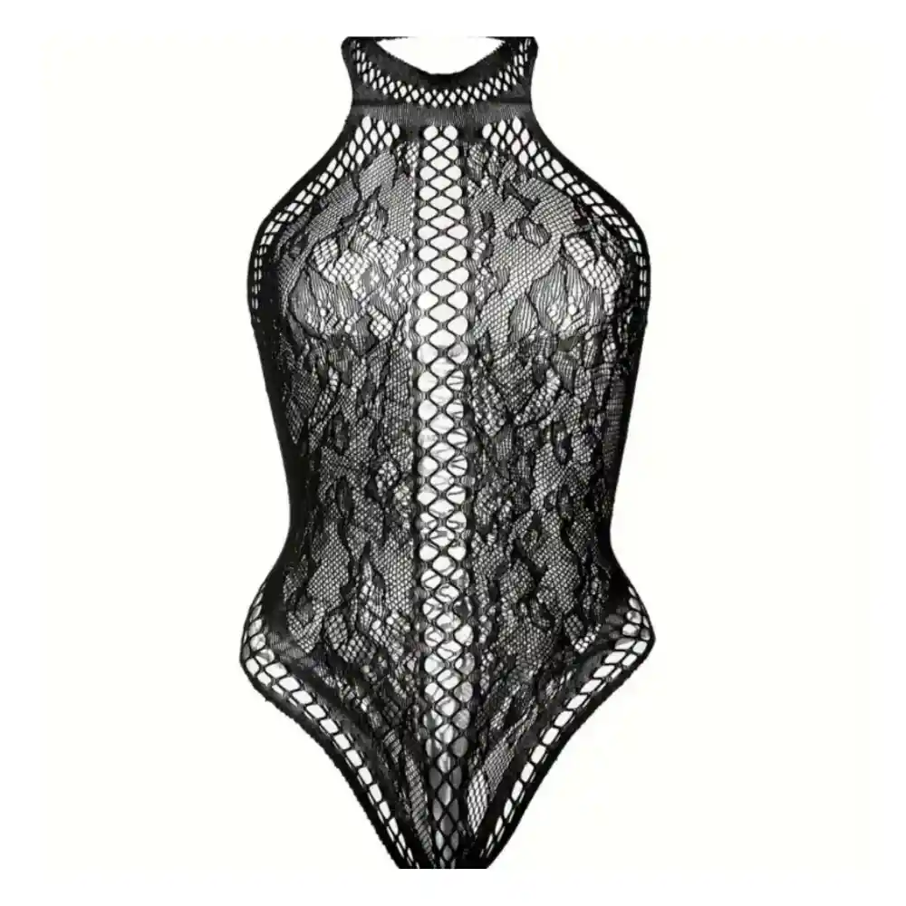 Body de encaje sexy con escote halter y espalda descubierta. Ajuste cómodo que moldea la figura, en poliamida y elastano con elasticidad media. Ideal para resaltar curvas y momentos íntimos.