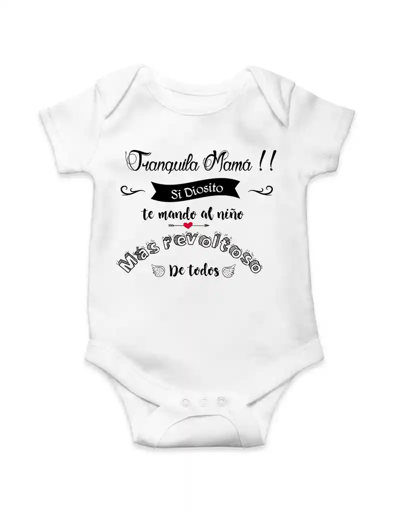 Body para bebe con mensaje "Tranquila mama si Diosito de mando al niño mas revoltoso de todos" personalizados, encuentras los mejores diseños creados con amor. Recuerda una de las mejores etapas de la vida de una manera tierna y divertida. Color blanco, manga corta, material poli-algodón. Tallas 0,3 3-6, 6-9, 9,-12 meses "DEJANOS UN MENSAJE EN LOS COMENTARIOS DE LA COMPRA QUE TALLA TE ENVIAMOS. Es un gusto atenderte estamos para servir ATT: "RETRATO DE AMOR"
