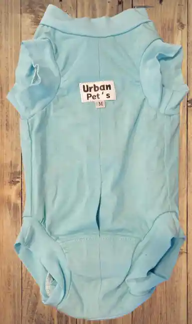 Body Postquirúrgico para macho en talla M. Ideal para mascotas de tallaje pequeño a mediano, cuenta con unas medidas de 39 cm de largo, 22 cm de ancho y una circunferencia en el cuello de 31 cm.