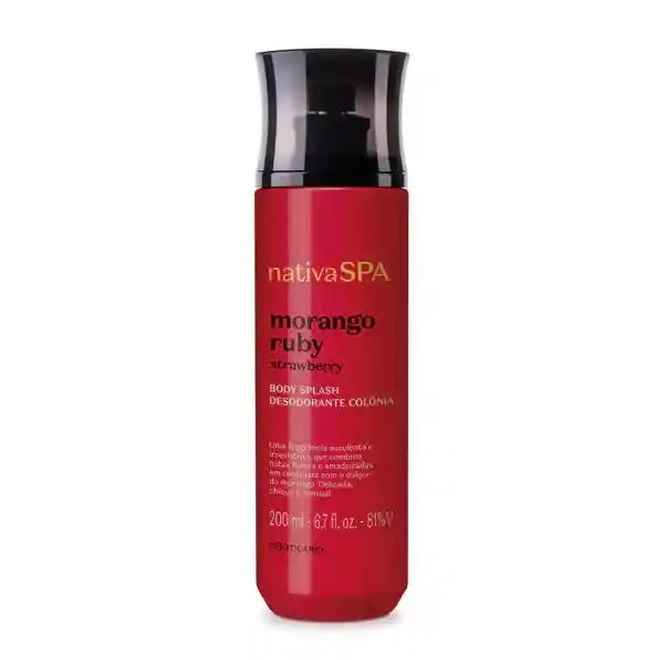 NATIVA SPA | Body splash corporal de fresa 200ml NATIVA SPA Body splash corporal ¡El Body Splash de Nativa SPA Morango Rubí prolonga la sensación de frescor después del baño con una fragancia irresistible! La fragancia body splash forma parte de la familia olfativa Chypre Frutal y desodoriza la piel con la combinación de notas florales y amaderadas en contraste con la dulzura de la fresa. Esta mezcla aporta un compuesto delicado, chic y sensual a tu rutina de cuidado personal. Comprueba las diversas ventajas que el body splash aporta a tu piel: · Formulado con alcohol ecológico; · Contiene glicerina que hidrata la piel hasta por 24 horas; · Elaborado con un 94% de ingredientes naturales. Ninguno de los productos de OBoticário está probado en animales, es decir, este artículo tiene el sello Cruelty Free.