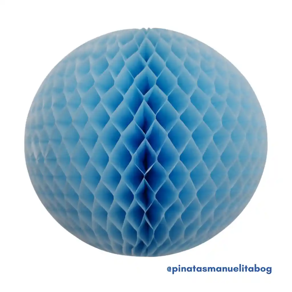 Bola en papel tipo panal en color azul cielo en tamaño de 22 cm de diámetro, incluye cuerda para colgar.