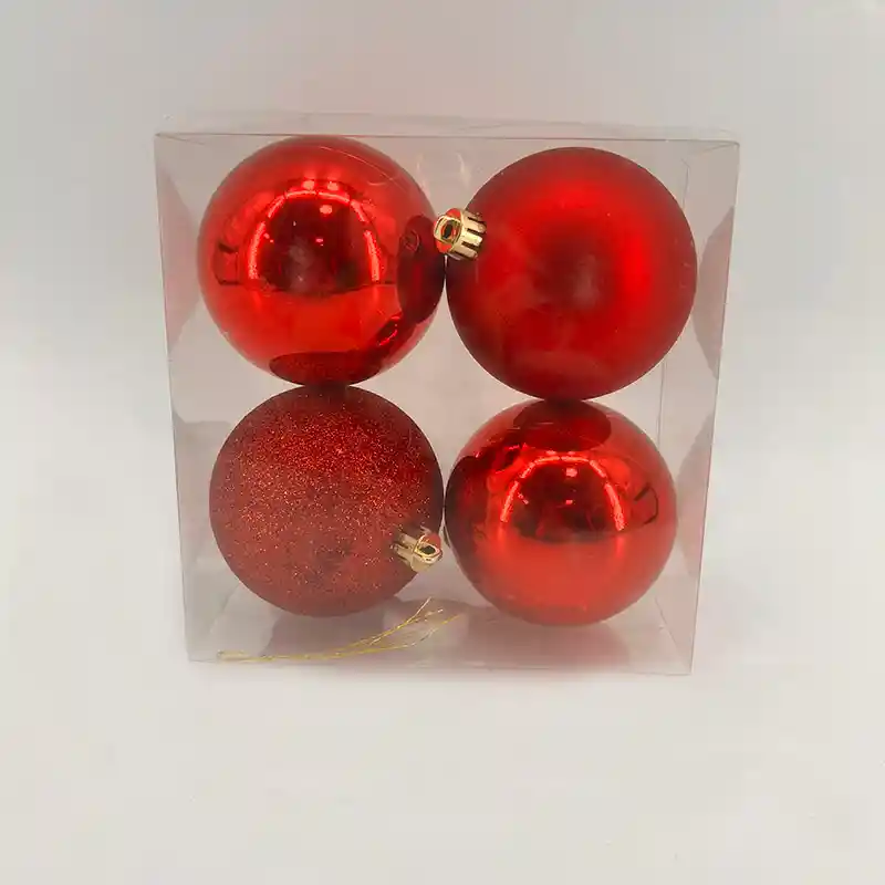 CAJA DE 4 BOLAS ROJAS MIXTAS. DOS SON BRILLANTES CON REFLEJO, UNA ES ESCARCHADA Y UNA ES MATE. CADA UNA CON UNA MEDIDA DE 8CM. VIENE EN UNA CAJA TRANSPARENTE DE ACETATO.