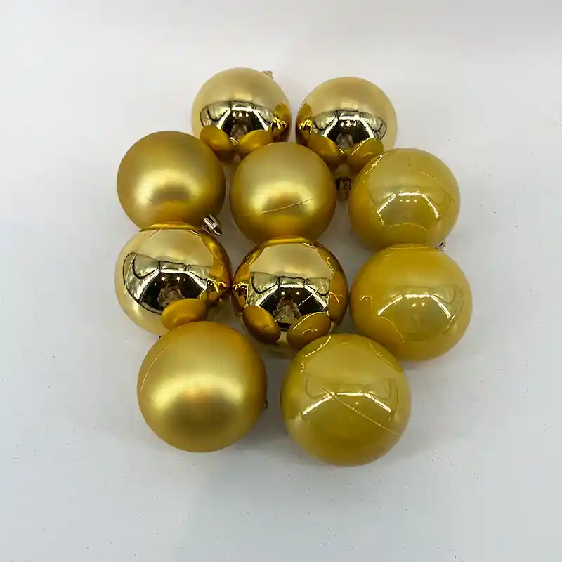 PAQUETE DE 10 BOLAS DORADAS MIXTAS. VIENEN ALGUNAS MATE Y OTRAS BRILLANTES. CUENTA CADA UNA CON UNA MEDIDA DE 7CM Y VIENE EN UNA CAJA TUBO TRANSPARENTE DE ACETATO.