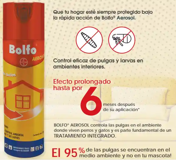 Bolfo® Aerosol es un pulguicida con acción larvicida, específicamente formulado para el control de las pulgas Ctenocephalides sp. en el medio ambiente. Bolfo® Aerosol elimina rápidamente insectos adultos y formas juveniles de las pulgas proporcionando una eficacia prolongada en el tratamiento integrado de las pulgas en los lugares frecuentados por las mascotas. NOTA: NO DEBE APLICARSE EN MASCOTAS.