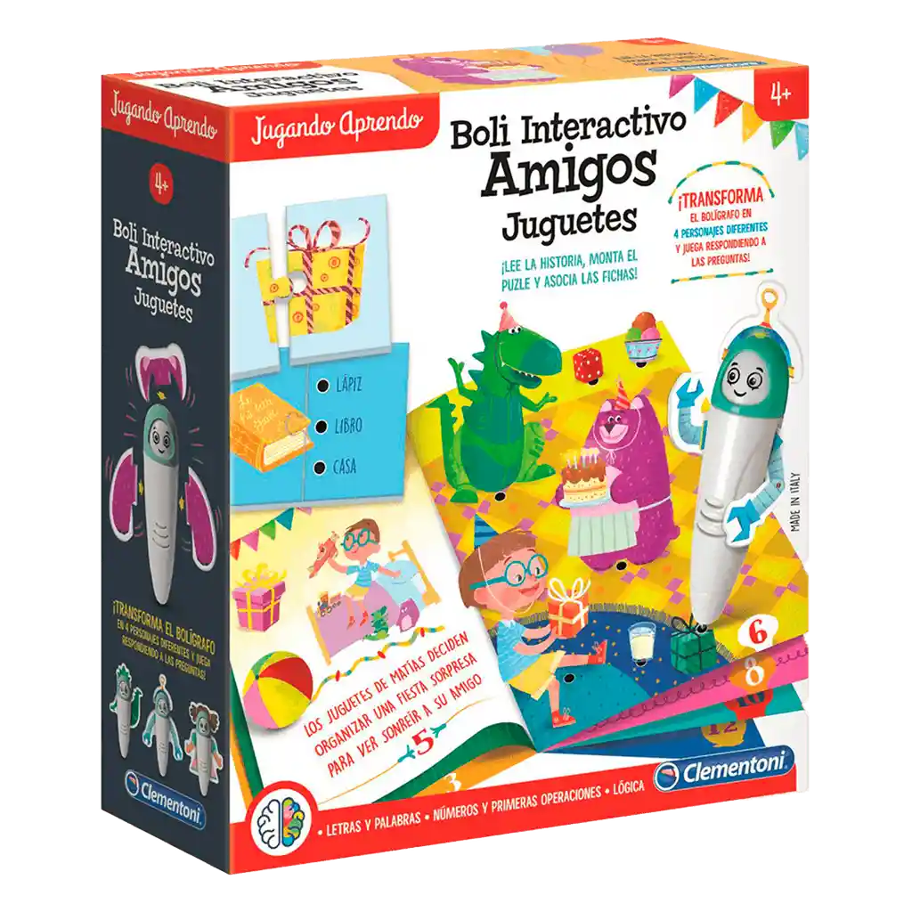 Los amigos de juguete de Matias han organizado una fantástica fiesta sorpresa para él, con muchos juegos para jugar juntos, mientras se divierten descubriendo todos los regalos que ha recibido. Contiene un libro ilustrado que cuenta una historia y propone actividades educativas con letras, números, operaciones y asociaciones lógicas, que se resolverán con el divertido boli electrónico. Se puede transformar en 4 personajes diferentes gracias a los múltiples accesorios de cartón. Edad recomendada 4+ Tamaño = 25 X 29 X 9 Centimetros