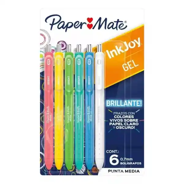 Paper Mate Ink Joy Gel Bolígrafos brillantes de punta media x6 unidades 2198010 BOLIGRAFOS PAPER MATE INKJOY GEL BRILLANTE ¡Trazos con colores vivos tanto en papel claro como oscuro! Trazo fino 0.7mm 6 colores brillantes surtidos. Son retractiles. *GENERAMOS FACTURA ELECTRONICA*