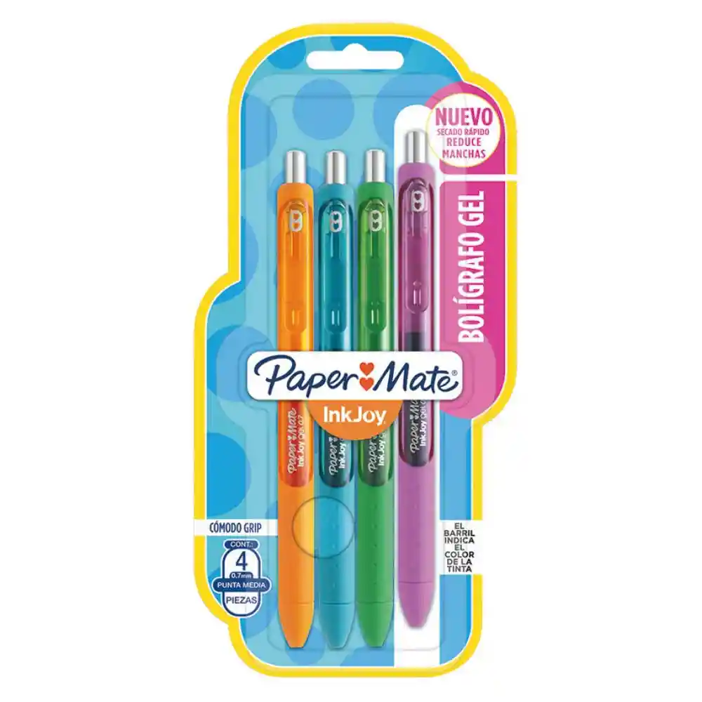 Set de 4 bolígrafos de gel Paper Mate InkJoy punta media colores surtidos Paper Mate® InkJoy® Plumas de Gel, de Medio Punto, Surtidos, 4 Pack Seca 3 veces más rápido para reducir la borrosidad de colores.