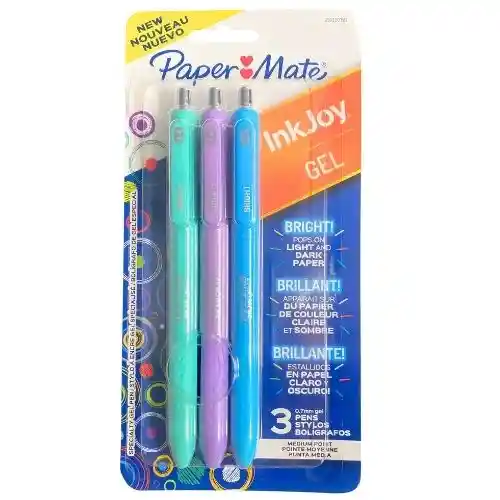 Bolígrafos InkJoy Paper Mate Brillantes, un set de 3 unidades diseñadas para quienes aman escribir, crear y destacar. Su tinta en gel brillante, similar al efecto de la pintura, ofrece un acabado luminoso que resalta con intensidad tanto en papel claro como en papel oscuro, convirtiéndolos en la opción perfecta para añadir personalidad a cada trazo. ¿Qué es? Un set de 3 bolígrafos en gel Paper Mate InkJoy con tinta brillante y colores surtidos. Su diseño retráctil y su punta de 0,7 mm permiten una escritura suave y controlada, ideal para trazos nítidos. Además, cuentan con un agarre ergonómico 360°, que rodea todo el cuerpo del bolígrafo para ofrecer mayor comodidad durante largas sesiones de escritura y dibujo. Ficha técnica Tipo: Bolígrafo en gel brillante Punta: Mediana 0,7 mm Mecanismo: Retráctil Colores: Surtidos (set x3) Acabado de tinta: Brillante / efecto pintura Agarre: Ergonómico de cobertura total Recomendación: Evitar papel brillante, muy liso o estucado para mejores resultados ¿Para qué puede servir? Los InkJoy Brillantes son ideales para: Bullet journaling y agendas tipo planner Acentuar textos, títulos y detalles especiales Doodles y garabatos creativos Creación de tarjetas, invitaciones o notas decorativas Proyectos escolares y manualidades Escritura casual con un toque luminoso
