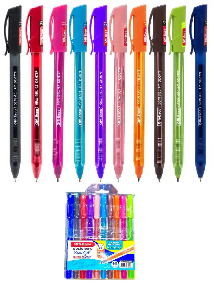 Boligrafos Semi Gel Punta Fina de 0.7mm Colores Surtidos (vivos e intensos) paquete x 10 unidades. Cuerpo triangular con agarre ergonomico