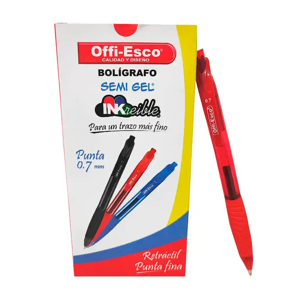 Bolígrafo Semi-Gel offi-esco punta 0.7 mm Retráctil caja x 12 unidades color rojo. Somos Bocetos Papelería. Empresa Santandereana, ubicados en Bucaramanga, con más de 35 años en el mercado, orgullosos de ser distinguidos en el ámbito comercial, por cumplir a cabalidad nuestra mayor política: brindar siempre y en todo momento una experiencia de satisfacción total a las necesidades de nuestros clientes. -Disfruta de una agradable escritura sin interrupciones -Tinta semi gel -Suavidad incomparable -Punta de carburo de tungsteno -Novedoso agarre con superficie arenosa -Diseño avanzado -Gran rendimiento -clip resistente -eficiencia sistema retráctil -Punta 0.7 mm para un trazo más fino