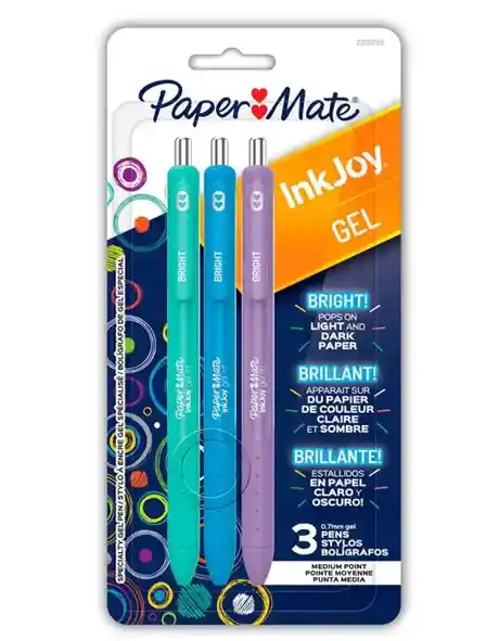 ¡Los colores vibrantes de los bolígrafos Paper Mate InkJoy irradian más que nunca! • Punta de 0.8 mm • Colores pastel • Mecanismo retráctil • Cómodo agarre • Contenido: 3 unidades